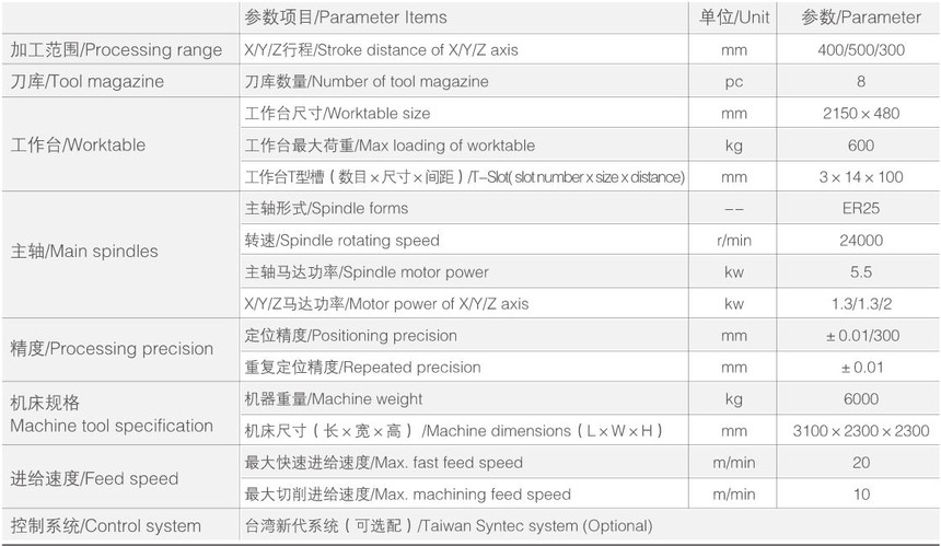 技術亮(liang)點: Technical highlights: 1、 全機(ji)采用GB-HT300樹(shù)脂砂造(zao)型鑄件(jiàn),經回火(huo)處理和(hé)自然時(shí)效處理(li)消🔞除内(nèi)應力。 The whole machine adopts GB-HT300 resin sand molding castings, which are treated with fire and natural aging to eliminate internal stress. 2、 内(nei)藏式配(pei)重:配重(zhong)附導杆(gan),上下移(yí)動時配(pei)重不晃(huǎng)動。 Built-in counterweight: the counterweight is attached with a guide rod, and the counterweight does not shake when moving up and down. 3、 各滑(hua)動面使(shi)用自動(dong)潤滑泵(beng)裝置,确(què)保機床(chuang)的使用(yong)壽命。 Each sliding surface uses an automatic lubrication pump device to ensure the service life of the machine . 4、 全(quan)密封钣(bǎn)金,操作(zuo)方便,防(fáng)水效果(guǒ)安全性(xing)好。 Fully sealed sheet metal, easy to operate, waterproof and safe.